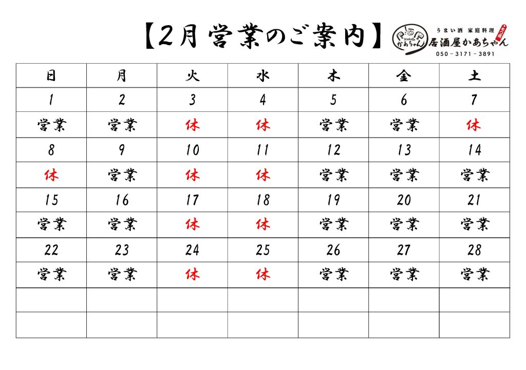 2026年2月の営業カレンダーは以下の通りですので、宜しくお願い致します。